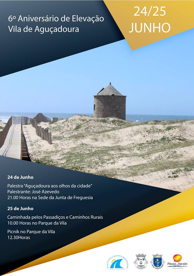 Aguçadoura comemora o 6º aniversário de elevação a Vila nos dias 24 (palestra “Aguçadoura aos olhos da cidade”, por José de Azevedo, às 21h00) e 25 de junho (caminhada pelo passadiço e caminhos rurais, às 10h00; piquenique no Parque da Vila, às 12h30).