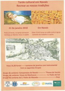 Às 16h30, poderão ouvir-se os cantares de janeiras com instrumental, com a participação dos seguintes conjuntos: Camponeses de Navais; Vozes de Manhouce (de S. Pedro do Sul); e Grupo de Cantares de S. Pedro de Maceda (de Ovar).
