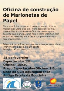 A sede do GCR Aguçadourense, localizada na antiga Escola da Boucinha recebe o espetáculo “A Mala Voadora”, seguido de uma Oficina de construção.